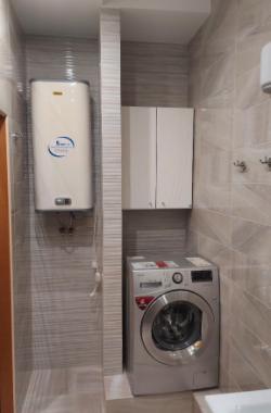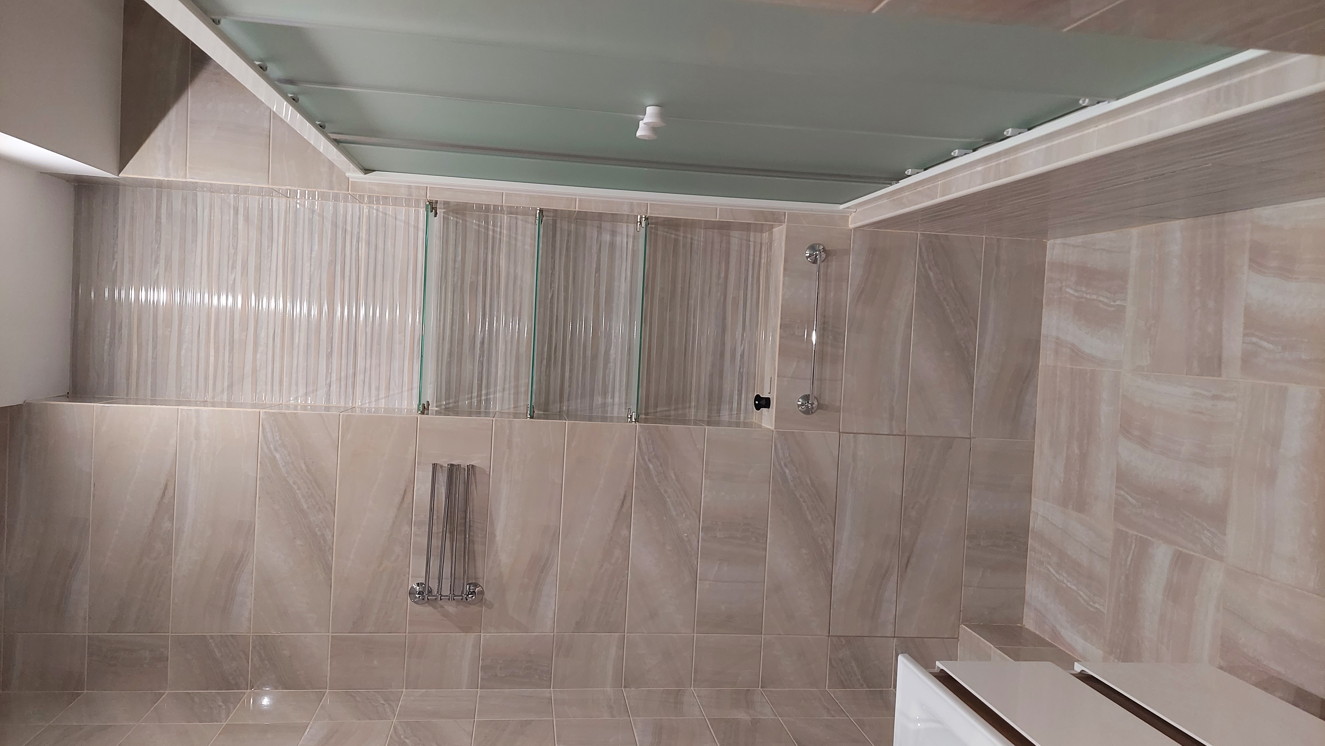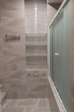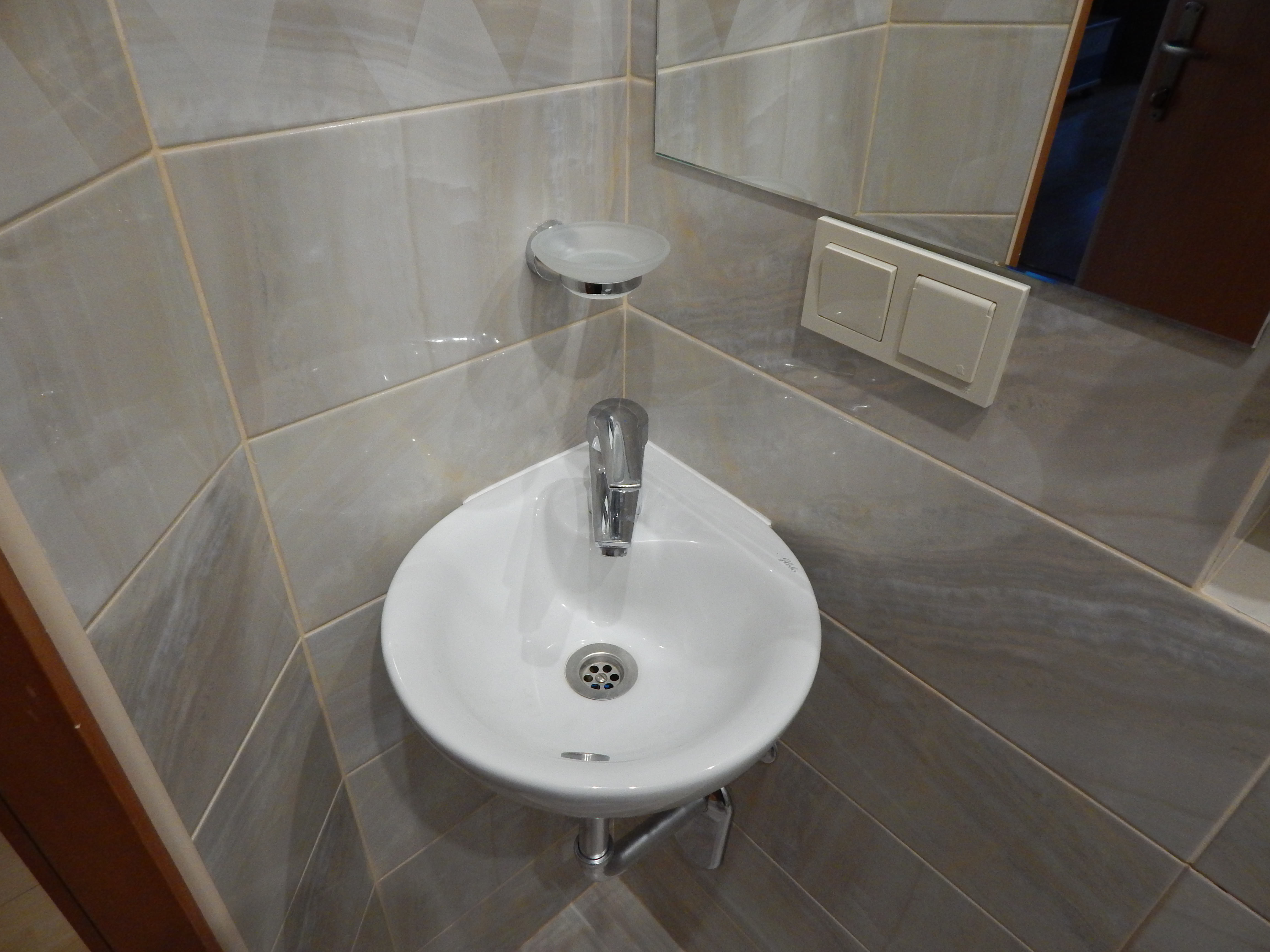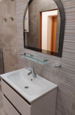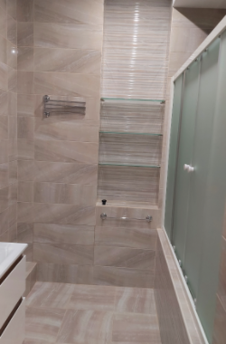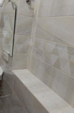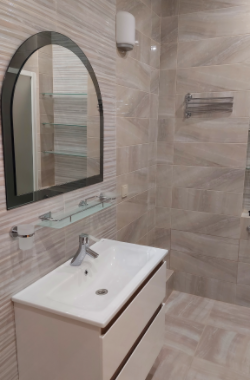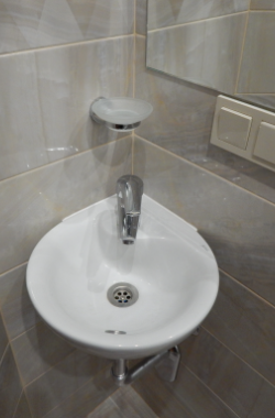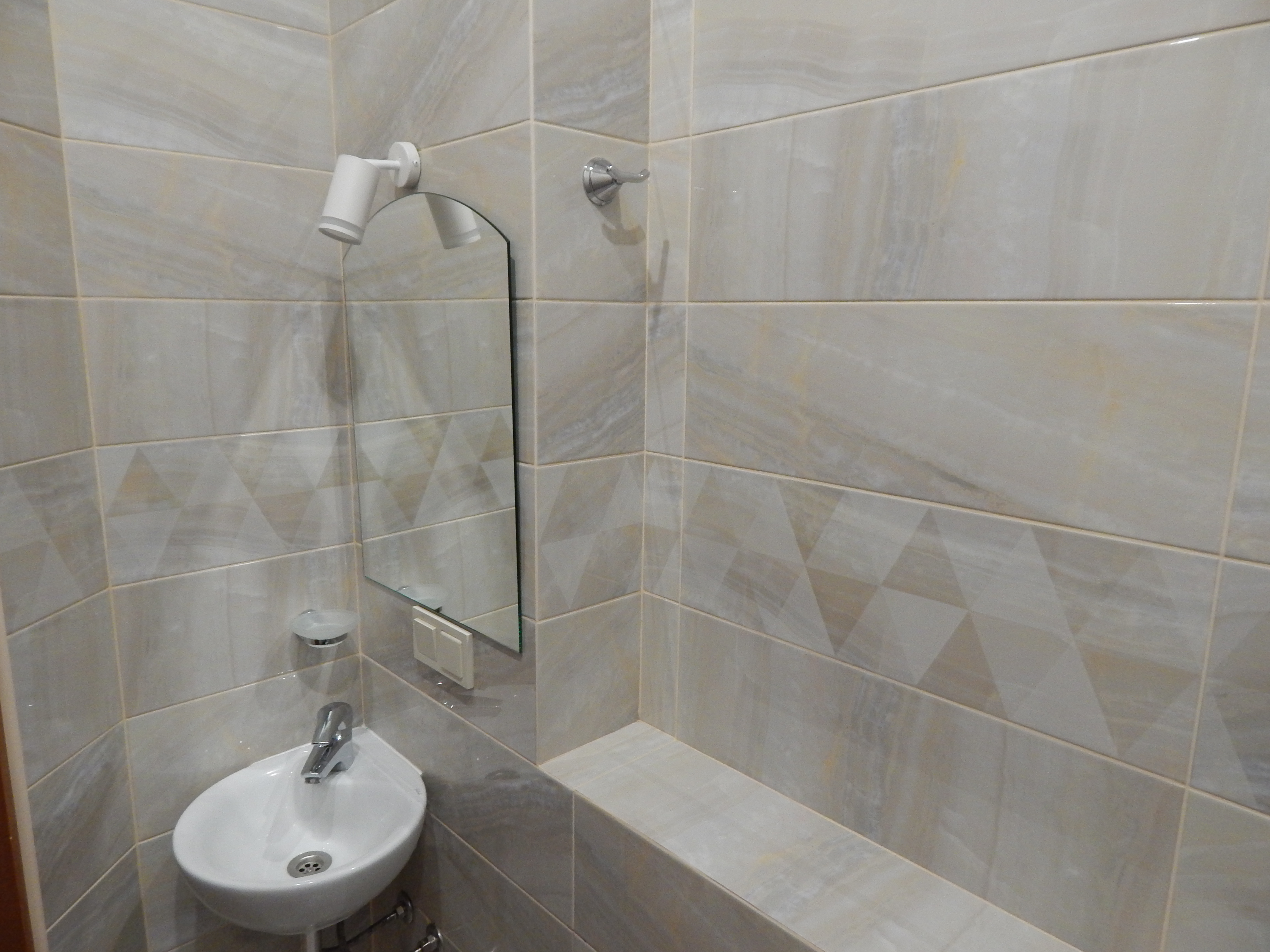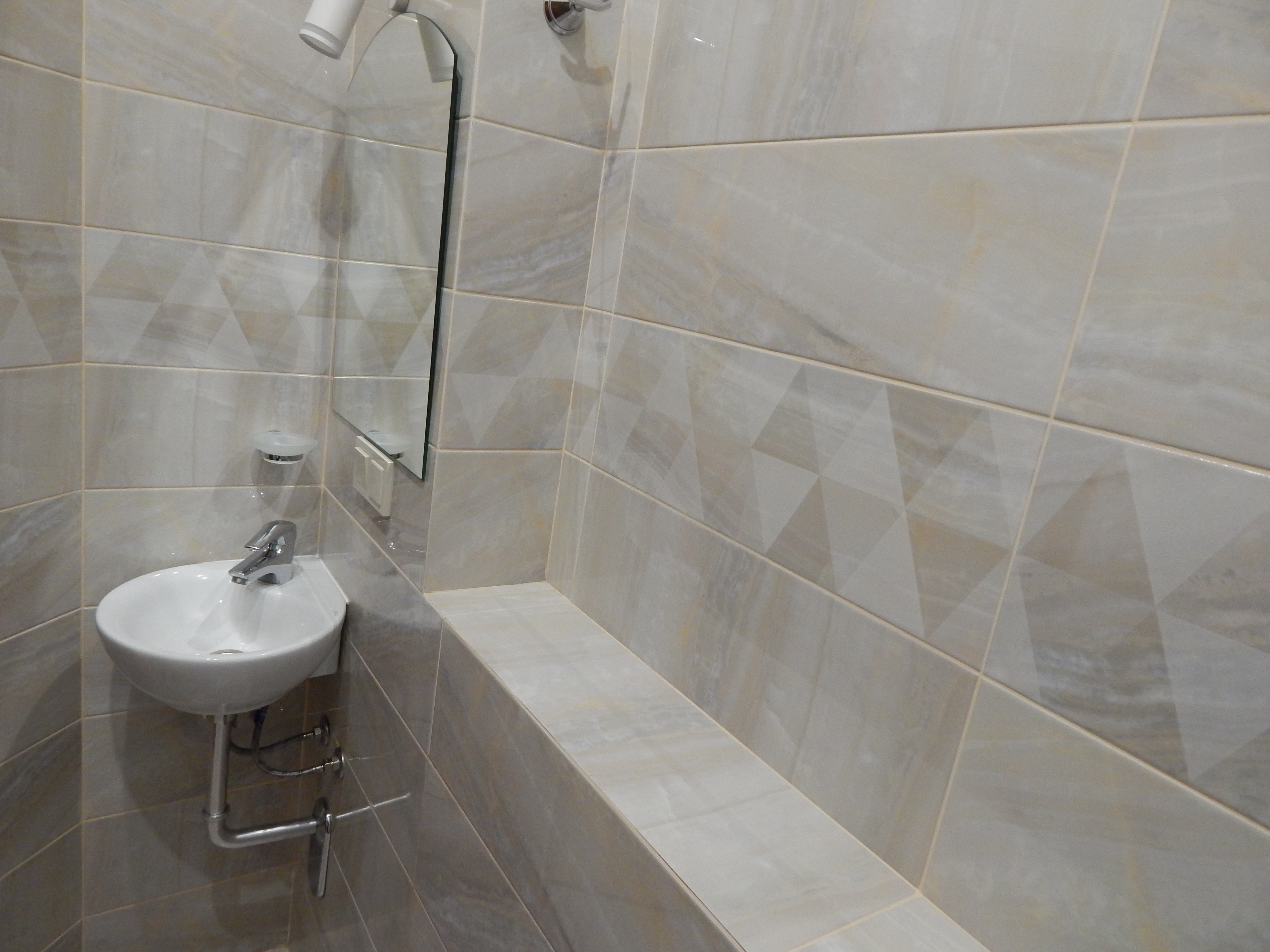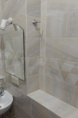 После этого были выполнены плиточные работы: пол облицован керамогранитом, а стены плиткой с обработкой торцов под 45 градусов. После этого была установлена сантехника, электроприборы и аксессуары.
