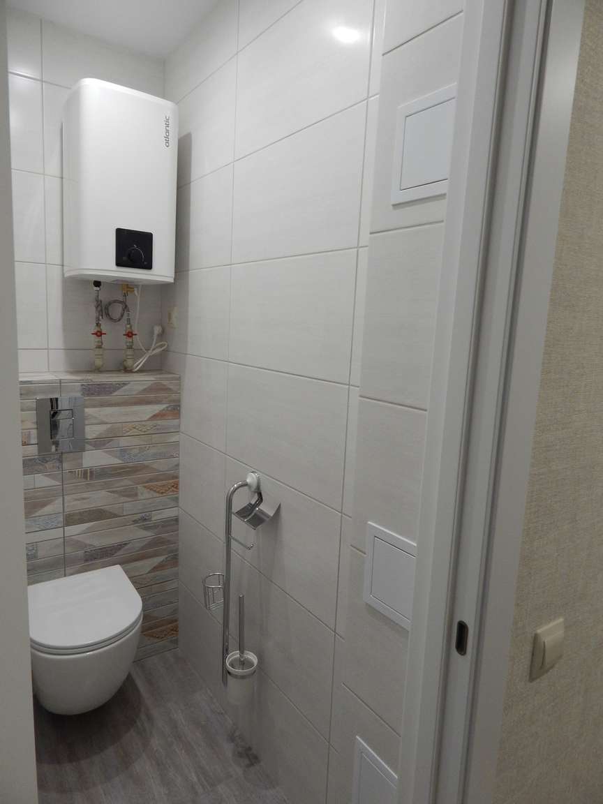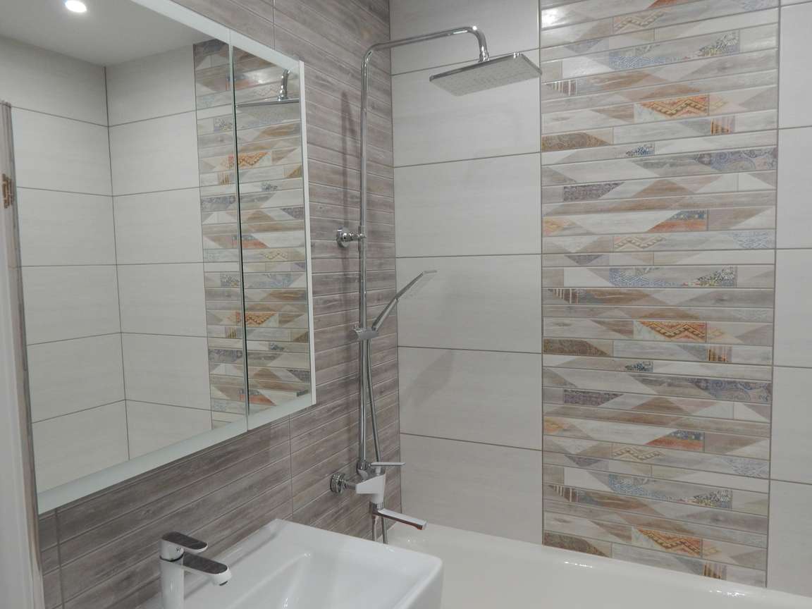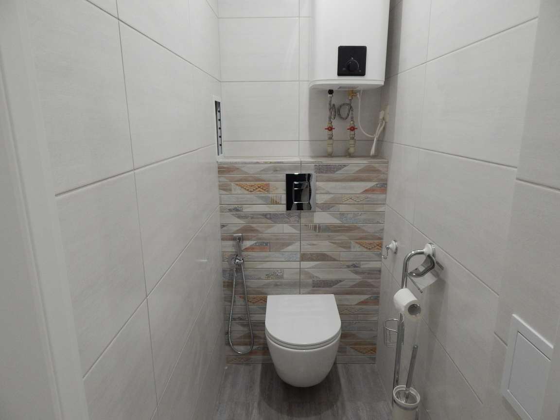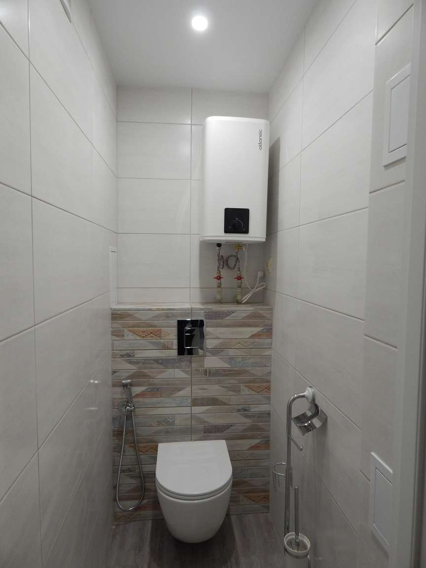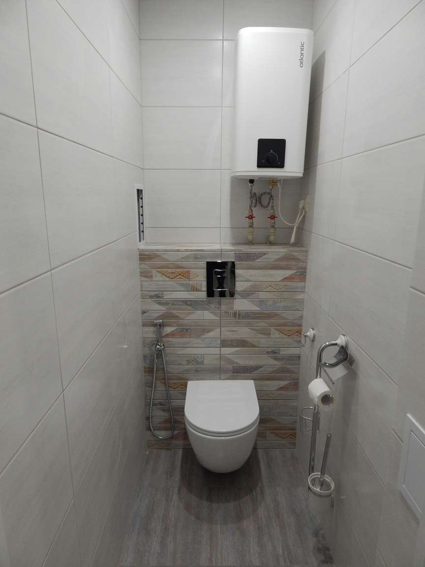 После того, как были выполнены все монтажные (расширение и заужение дверных проемов, монтаж ГКЛ коробов и ниш, монтаж вентиляции) и черновые отделочные (гидроизоляция, стяжка, штукатурка) работы, санузел и ванная были облицованы плиткой. Торцы плитки были запилены под 45 градусов. Впоследствии была установлена металлическая ванна, новая сантехника, бойлер, мебель и аксессуары.