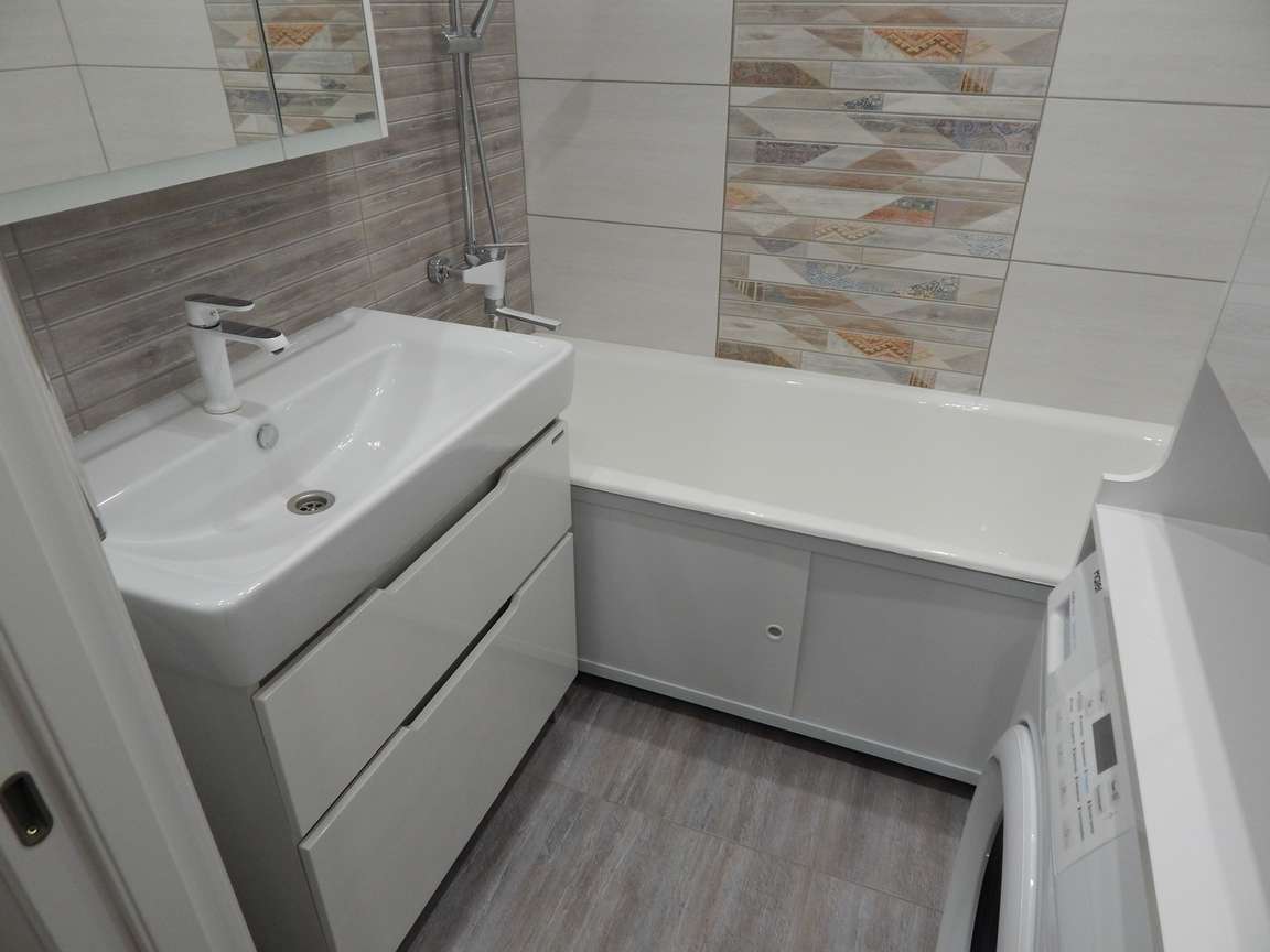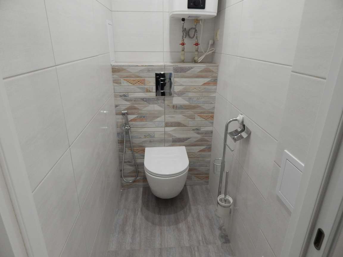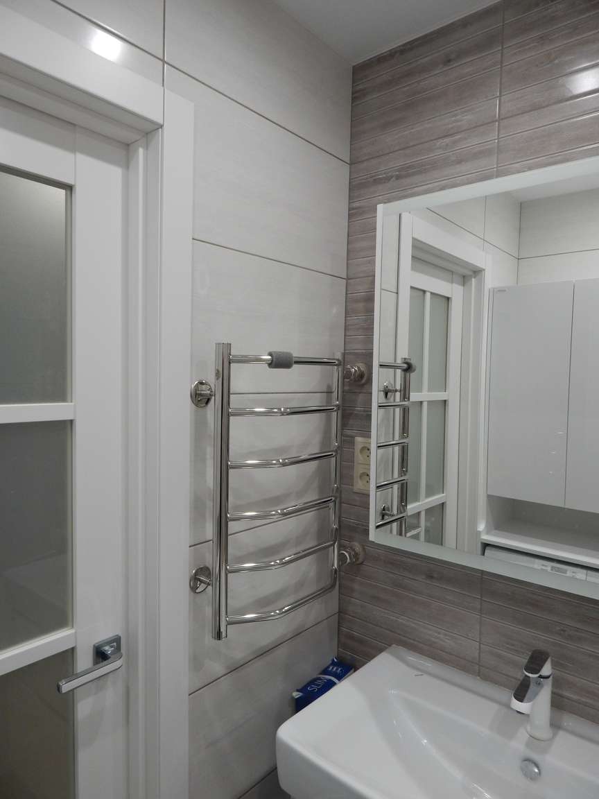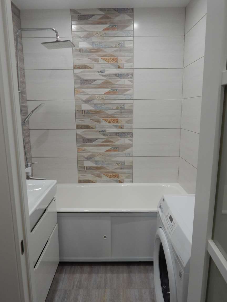 После того, как были выполнены все монтажные (расширение и заужение дверных проемов, монтаж ГКЛ коробов и ниш, монтаж вентиляции) и черновые отделочные (гидроизоляция, стяжка, штукатурка) работы, санузел и ванная были облицованы плиткой. Торцы плитки были запилены под 45 градусов. Впоследствии была установлена металлическая ванна, новая сантехника, бойлер, мебель и аксессуары.
