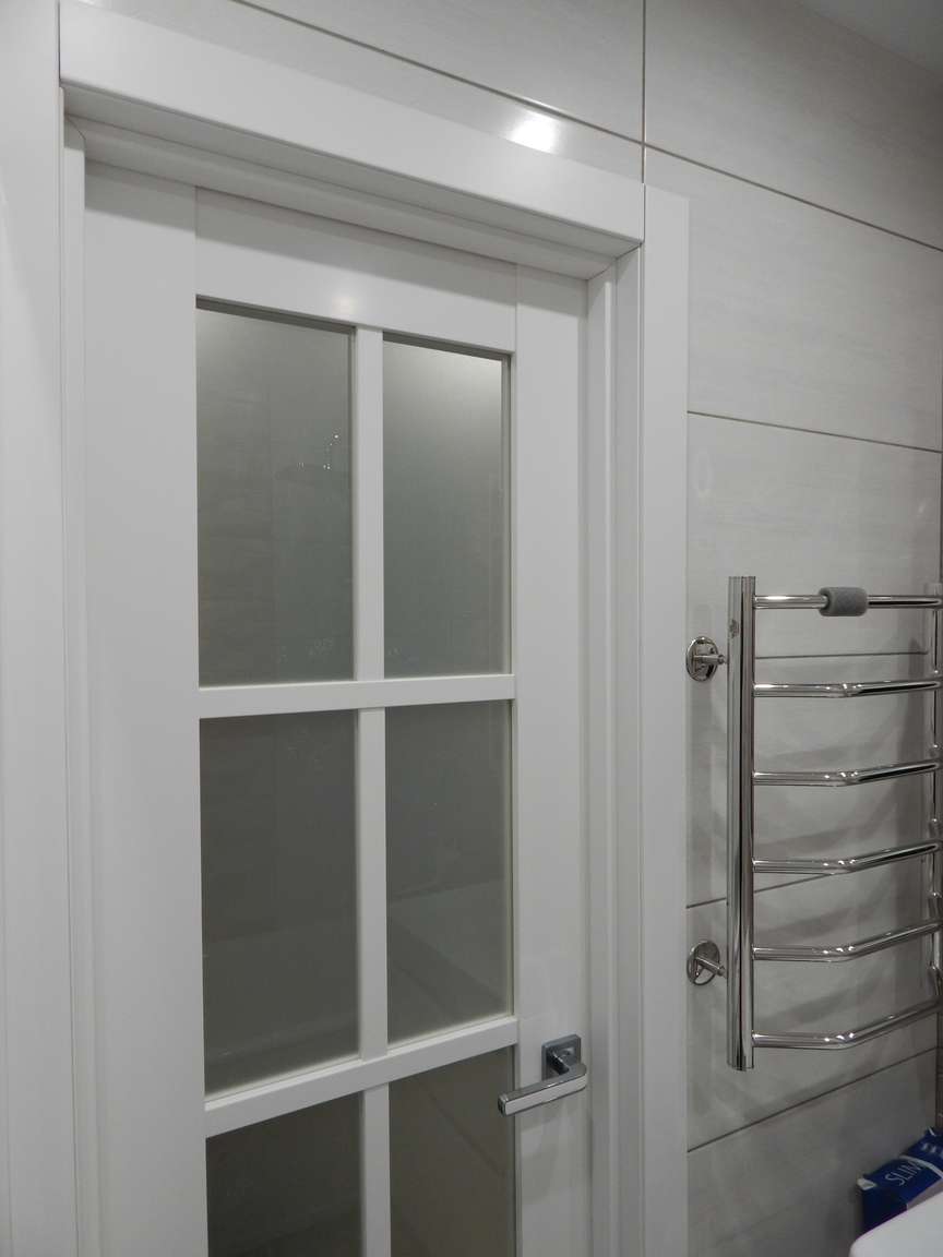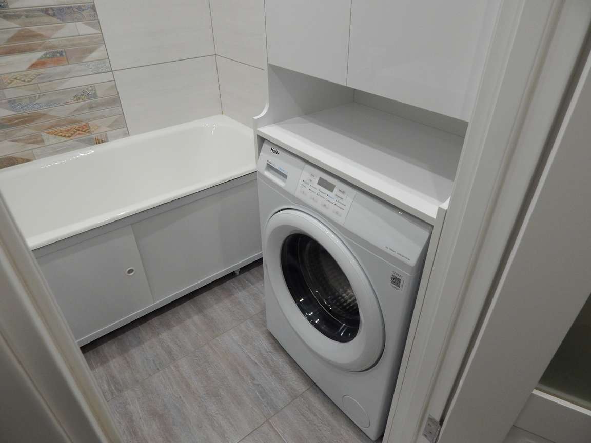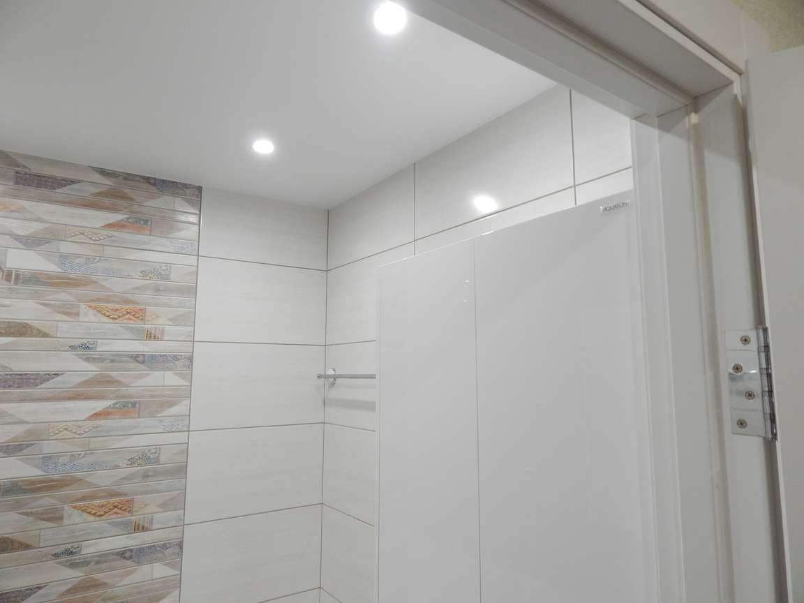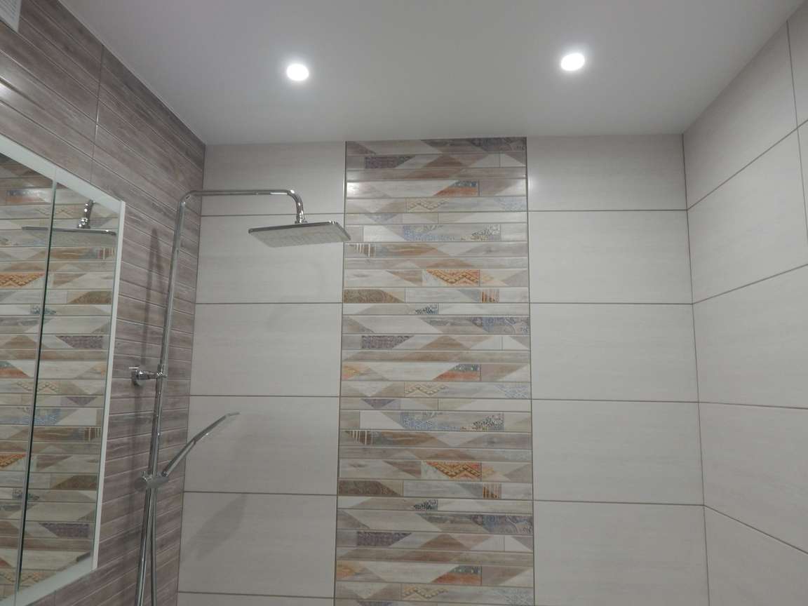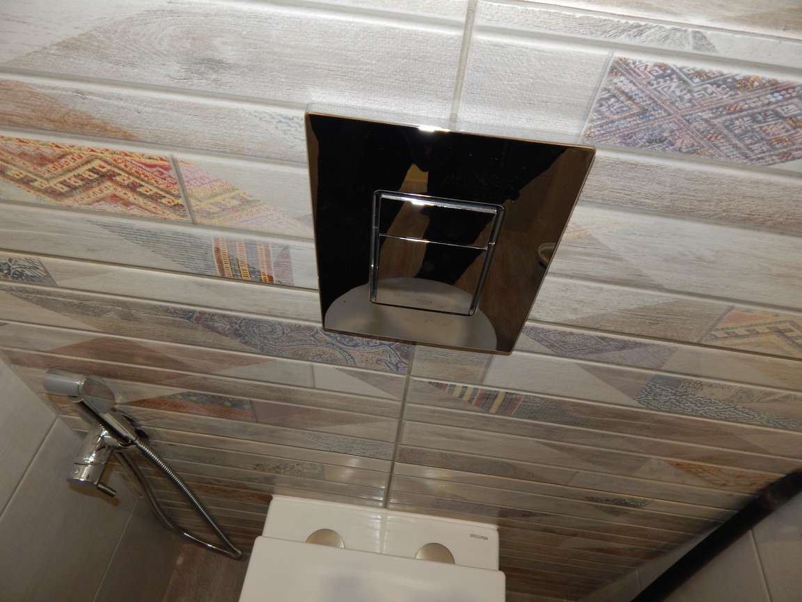 После того, как были выполнены все монтажные (расширение и заужение дверных проемов, монтаж ГКЛ коробов и ниш, монтаж вентиляции) и черновые отделочные (гидроизоляция, стяжка, штукатурка) работы, санузел и ванная были облицованы плиткой. Торцы плитки были запилены под 45 градусов. Впоследствии была установлена металлическая ванна, новая сантехника, бойлер, мебель и аксессуары.