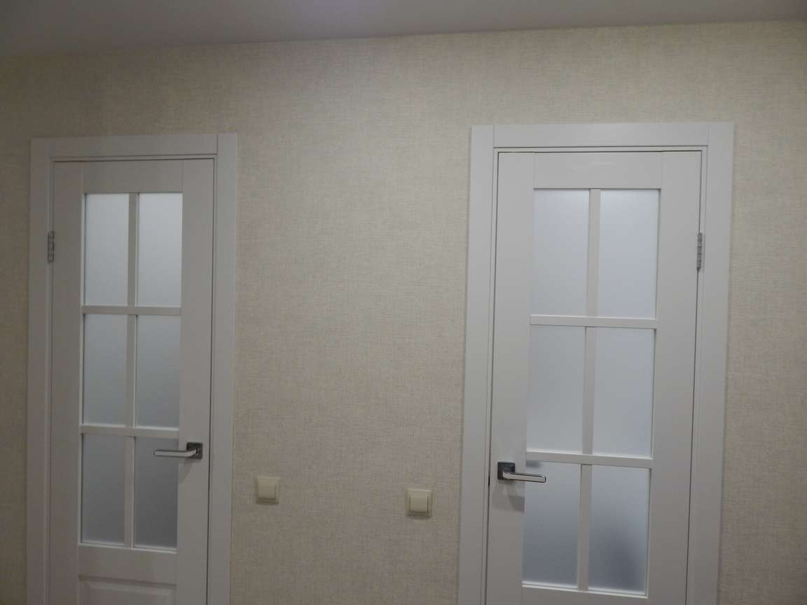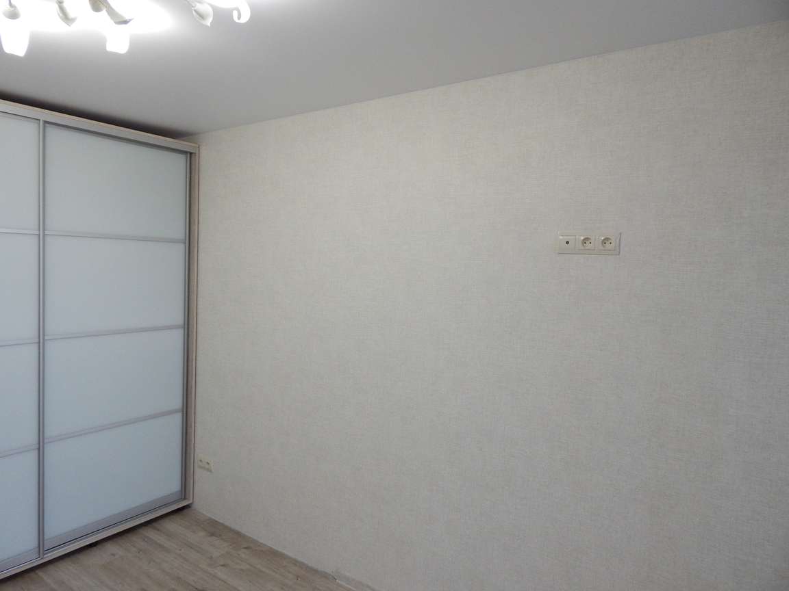 После предчистовой отделки в жилых комнатах (устройства наливных полов, шпатлевки стен и откосов), там были выполнены чистовые работы: поклеены обои на стены, уложен ламинат на пол и смонтирован плинтус, установлены порожки, покрашены стены на лоджиях, покрашены трубы и смонтированы уголки на откосах. После этого был выполнен заключительный этап электромонтажных работ : установлена электроарматура (розетки, выключатели), светильники и люстра.